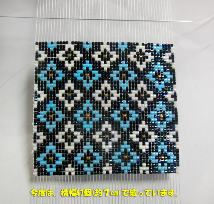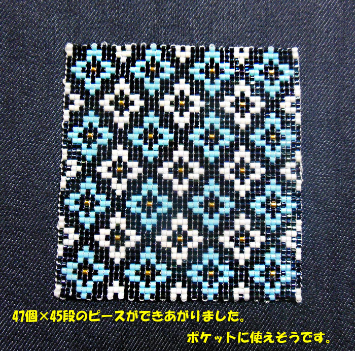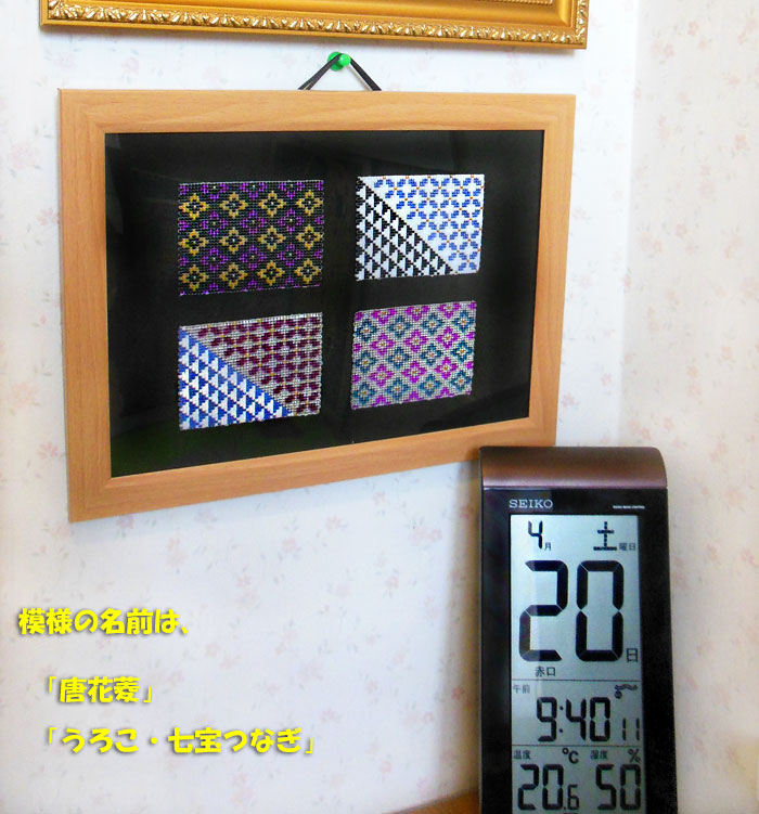 今までパステル画を入れていた額に、黒の台紙に両面テープでビーズ織のピースを貼って、飾ってみましたよ。