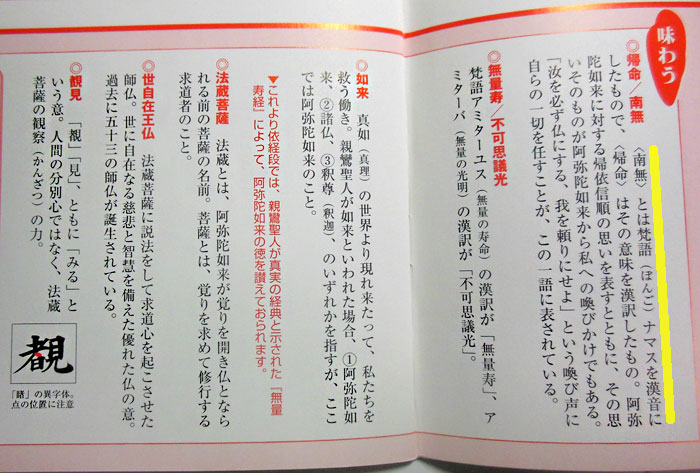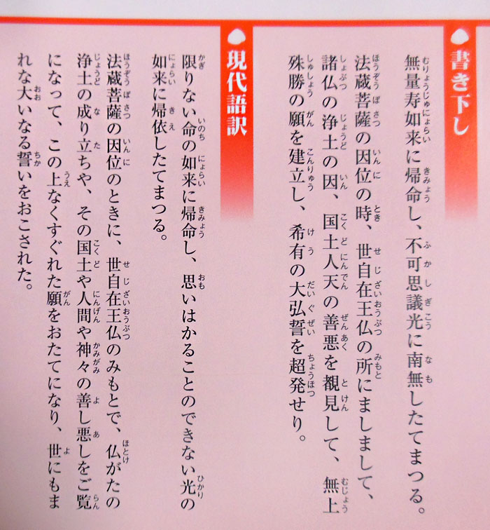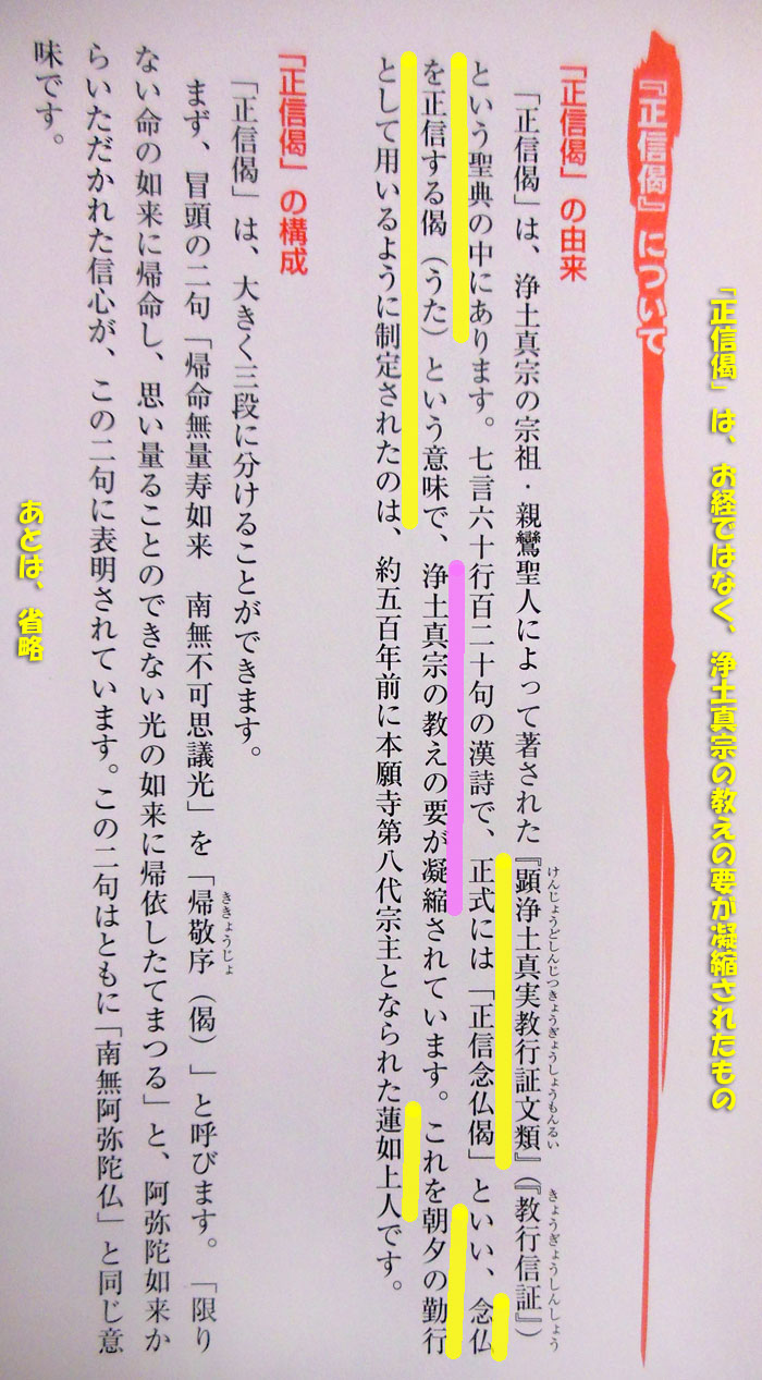 だけど、ひょっとしたら、浄土真宗の人たちは、 正信偈 を暗唱できるのかな? 私は父の葬儀関連の法事の時に、お坊さんが唱えるのを聴いたくらい。小さな冊子を渡されて、一緒になんかついて唱えたけれど、それくらいだから、最初の二行しか覚えていません。