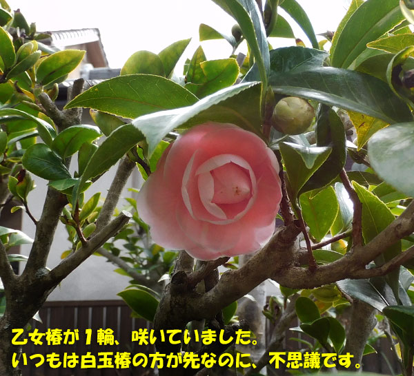 なんと、今日、我が家の「 ​乙女椿​ 」が咲いているのに気付きました。
