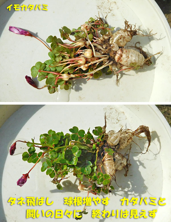 イモカタバミをひょいっと抜いたら、こんなに芋(球根)がついていた。