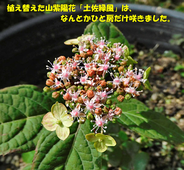 掘り出して、鉢植えにした「 山アジサイ土佐緑風