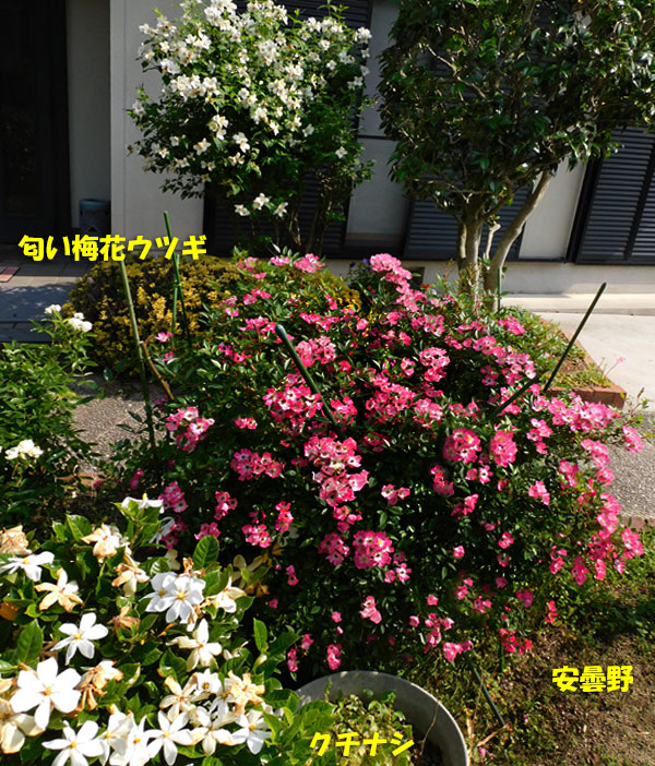 庭のあちこちに、 ​ミニバラ「安曇野」​ が咲いています。