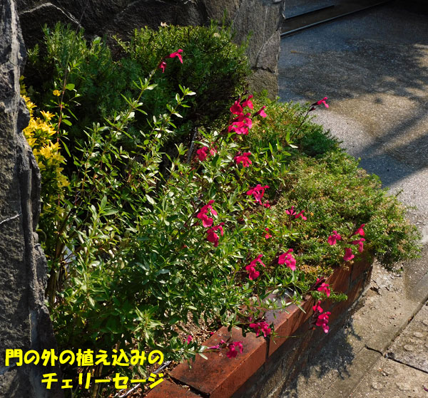 門の外の植え込みの赤い ​チェリーセージ​ も、