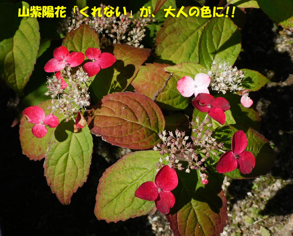 ​山紫陽花「くれない」​ は、ずいぶんと濃い赤になってきました。