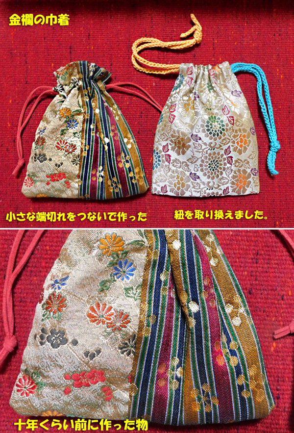 左側の巾着は、だいぶ前に作って、大事な物を持ち歩くときに使っていました。