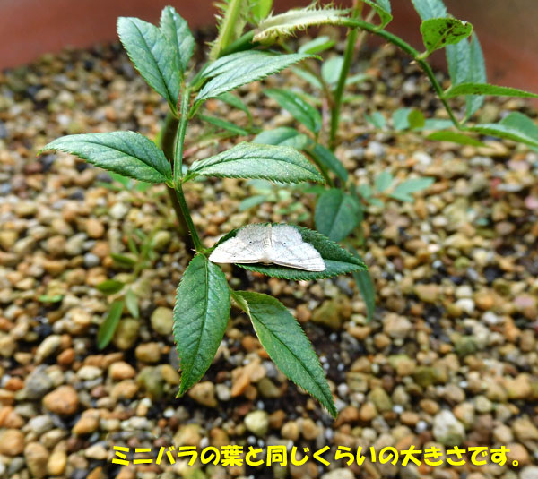 このガはとっても小さくて、ミニバラの葉っぱにぴったりサイズ。