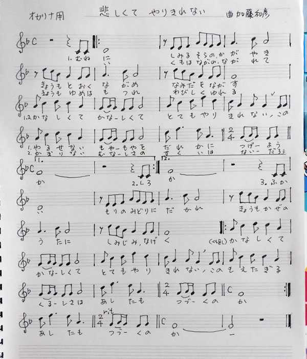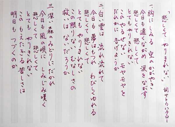 最後に、「悲しくてやりきれない」の楽譜と歌詞をのせます。