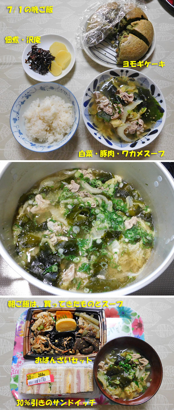 私の朝ごはんは、買ってきたばかりのお惣菜とサンドイッチ。