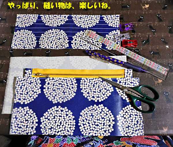 手前の紅型(びんがた)模様の生地は、私が今着ている部屋着。