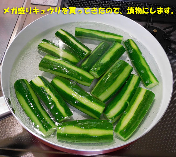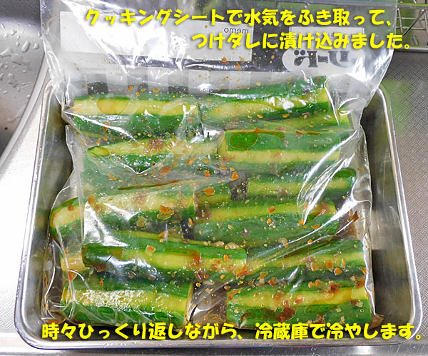 キュウリは、フライパンで茹でてから、タレに漬け込んだものです。