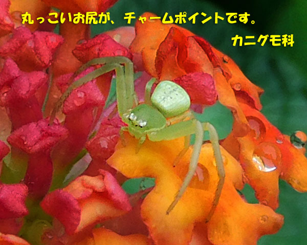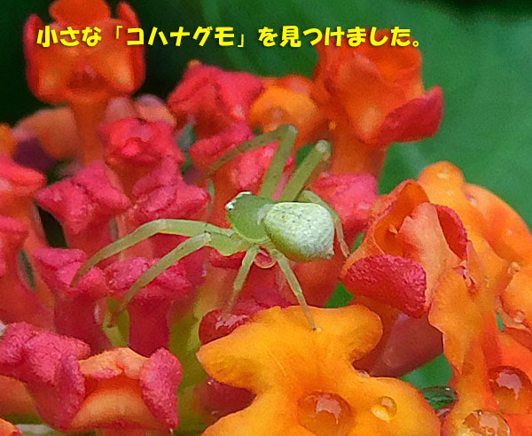 バッタがいないか、ランタナを見に行ったら、小さなクモ発見。