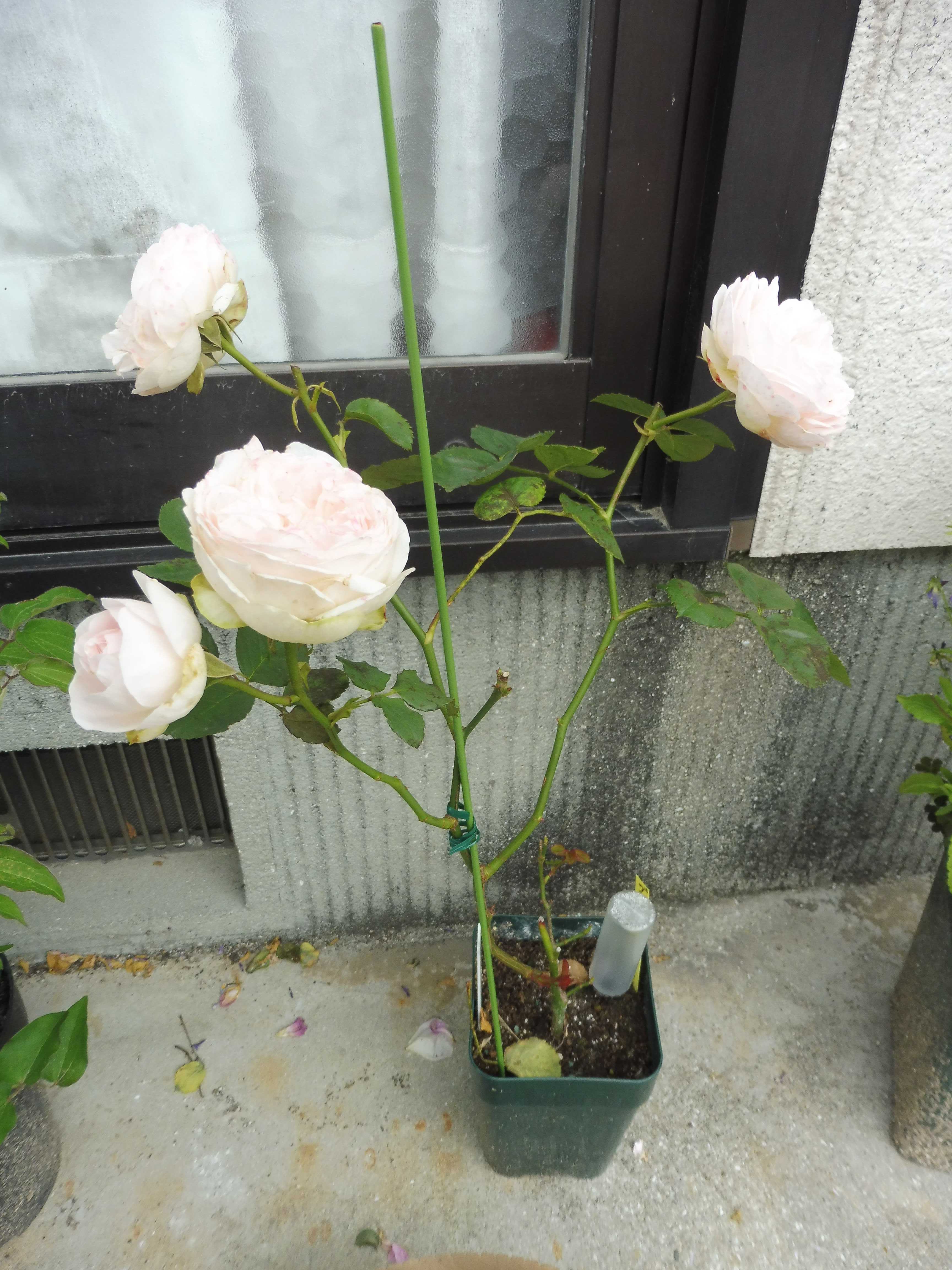 白のセブンスターローズの枝代わり。セブンスターローズにほんのり桜色がのっています。