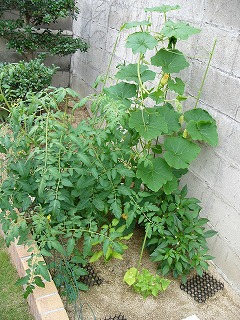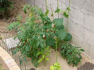 ああ、どうしようトマトとカボチャがえらいことになっています ついにカボチャが、トマトより大きくなり、あんどん仕立て用の支えをはみ出して、蔓をトマトに送りこみ、締めにいきました(泣)とりあえずレフェリーブレークだけはしましたが、孤高の暴君「トマト」VS反逆の一匹狼「カボチャ」、今後どうさばいたらいいのか想像もつきませんもうさすがに成長も止まると思うんですがねえお互いに花も咲かせまくってますまわりの野菜とかとばっちり食ってますが、見て見ぬふりですまるさん(だったかな?)に「空飛ぶカボチャ」って命名してもらいましたが、本当に最後までそれでいこうかと思い始めました地面に付けると(マルチングとかしても)きっと腐りそうな感じですいける限り、離しておいて、適当なタイミングでばさっと切って食べようかと(笑)実ですか?じつは一杯ついてるんです こんなにたくさんつくとは存じませんでした 花が咲き終わったあとが、なんにも実がないのと、こんな感じになってるのと二つに分かれてるんですけどねえ・・・カボチャ高いから、1個でもできればもとがとれるのに、10個くらいこういうのがありましてね どうなんでしょう? ほっといていいのかな 多すぎ??みねさんが、「フライングソーサー」で美を楽しむなら、我が家は「フライングパンプキン」で美味しさで勝負するのだ(笑)あれ?どなたか、「トマトはどうなの」って聞かれましたか?これがまたね、すごいことに・・・明日是非見てね (^_^;)