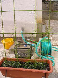 あんまり植えてる人を見たことがない「るこう草」(サイプレスバイン)ひょろひょろーっと一気に伸びつつあります写真で見て頂くとわかるんですが、あんまり葉っぱが生えておりませんところが、もう一番支柱の先までつるが届きつつある状況です どうするのかな、これどう見ても葉が少なすぎるんで日よけになんかなりそうもないんですけど(泣)もっと、背は高くなるでしょうから、ネットでも買ってきて、2階の窓から吊すくらいしないといけないのかも知れませんが、やっかいだなあ(^_^;)あんまり皆さんが買わない理由がわかってきましたねえIVY系と違って、冬は完全に枯れちゃうので、壁とかに這わすのも難しいし種は一杯できるらしいんで、ぼこぼこ野生化して芽吹くらしいし花はきれいなのよ、かわいいんですぜ星形で始末に困ってる私 σ(o^_^o)どうしようかなー とりあえず、もっと長い支柱づくりを考えます今は、アブラムシにとりつかれてますが、なんとか万能薬オルトランで退治することができたような気がしてますあと、小さなハエも寄ってきますねえ あっちいけ \(^^\) (/^^)/このプランタの今後に皆さん期待してねあとね、気がついたら77777を過ぎてるじゃないですか誰が踏まれたかもわかんない(泣)代わりに88888ヒットは絶対キリ番ねすっごーいプレゼントを用意してみんなをあっと言わせるのだ ( ̄^ ̄)・・・・「るこう草」の種とか、「空飛ぶカボチャ」とか (^^ゞ・・・・[追記]今帰ってきて(早いのねー(^_^;))、見たら、るこう草の先はあっという間に支柱を超えてはるか地上をさまよっておりますでもね、葉っぱはしょぼしょぼ(T_T)