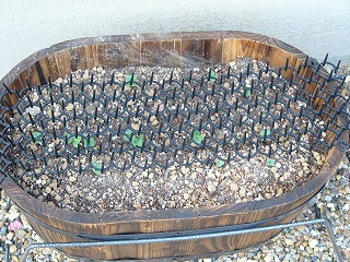こっそり先週にラディッシュ植えたんですよnew waveさんに感化されましてね 真似するの大好きだし結構簡単にできそうだしね種も安かったんですが たくさん植えて、間引けって書いてあるわたし思うんですがね、間引くのって無駄じゃないかな??それで一個一個離して植えて見ました 種まだまだ余ってますからねうまく行ったら、何回も作れますものねそしたら、まあまあ丁度うまい具合に芽が出ましたよ 『ラディッシュ間引かない法』として特許登録できないかな(笑)ちょっと不均等なのは、おバカなパスが1回全部掘り散らかしたからあわてて全部戻して、ご覧の通り、猫よけ用のカバーを利用して、パスよけを作りましたもう少ししたら外さないといけませんね同様にして、夏用花の種詰め合わせセットの方も芽が一杯に出ましたがこっちは間引かないとダメかなあ もう少ししてから、考えますこれも、全部撒かなくても良かったかも知れませんねさて、昨日からサッカーW杯が始まりましたね我が家は、子供が本当にミーハーで、前回、今回と長男、次男がその順にサッカーフィーバー(笑)に侵されてますわたしはサッカーは自分でやるのには、最高に面白いと思いますが(ボール一個でできるし、何人でもできるってのは魅力ですよね)、ずーっと見るのは正直に言ってちょっとダルイと思ってますので、家でチャンネル争いが (^_^;)分が悪いですけどね今の若い子はサッカーファンが多いですからね どうしても情報として見ておきたいらしいです ( ̄― ̄)(―_―)テレビで見てて面白いのは何かなあボーリング、ダーツ、ビリヤード あれ?スポーツじゃないや (~_~;)