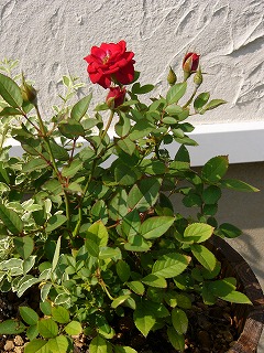 皆さん、バラバラ、バラバラ、好き勝手言ってる(○`ε´○)うらやましくてしょうがないやい(^_^;)今から出張に出かけるけど、その前にこの一言だけは・・・「我が家にも深紅のバラがあるんだい!」一時咲いたあと、全く音沙汰無かった、あのミニバラ「カリナ」ちゃんが大復活 (^^)//""""""パチパチ 咲き始めましたよ新しい蕾も一杯ついてます いつのまにこんなに元気になったんでしょうね 手前の蕾は、今日の朝は満開になってました小さなバラですから、見ごたえがさほどあるわけではないんですが、それでも花の形の美しさは格別です変な虫がこないように、オルトランを撒いたり、たっぷり肥料をやったり手を掛けた効果が出ましたね 嬉しいなあ・・・・・でも悪いニュースも一つるこう草が、おばかのバスの被害にあって (ノ_・。)また1本食いちぎられてます これで、2本やられました残りは4本です 何とか開花までは持って欲しいんですが・・・