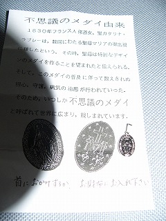 一つ大切なことをこの間書き残してました何かといいますとメダイって言うんですって、フランス語でメダルのことこの前に五島列島に行って、その時に「井持浦教会」というところに行って頂いてきました『不思議なメダイ』これも人徳でしょうか(笑)カソリックでは、神の代わりになるものを持つことが許されてるようで、こういったものを作ることもあるんだそうでプロテスタントは偶像は一切認めないということでそれはそれで大変ですねカソリック 神父≒司祭 結婚 法王頂点 ミサ 十字切るプロテスタント 牧師 結婚 独立 礼拝 祈るだそうですが、わかりやすいのは、飾ってる十字架にキリストがはりつけになっているのがカソリック、十字架のみはプロテスタントなんだそうでと、似非神道istのマトちゃんには勉強になりました ∩ヽ(。・ω・。)へぇ~(教徒の人には当然以上なんでしょうねえ 許してね(^_^;))それでね、メダルですよフランス語ではメダイ(MEDAILLE) メダイって何か美味しそう(^u^) 影で見にくいのはわたしのデジタルカメラの弱点で(^_^;)お財布に付けとくといいらしいんですけどねえ金の打ち出の小槌とバッティングしそうだなあ試しにヘルペス(かな?)をなぜてますがわたしには奇跡を見せてくれません (T.T))どうせ、オジサマは汚れてますよ(○`ε´○)
