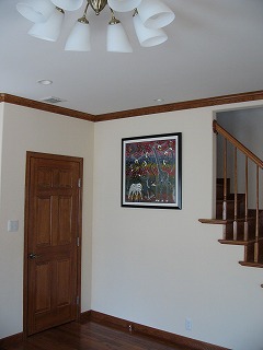 今日はこれからお出かけしますハニーと二人で久しぶりにコンサートにねちょっとご機嫌だったりします(^_^)それで、その前にちょっと前から引っ張ってる内容を書いとかないと皆さんに怒られてもいけませんからね実は前から悩んでましてねリビングの階段横に、下地も入れて結構大きなスペースでスポット照明までセットして、何か飾るつもりで、はや一年もう何も飾れないのかと悩んでたんですがね一番欲しかったのは、やっぱり油彩の風景画できれば「スパニッシュ」ちょっと譲っても「プロバンス」風ところがこのタイプのやつは良いのは高いんですよね~で、安いのは、素人の私から見ても、絶対掛けたくないような人工甘味料みたいな作品が多いじゃないですか最低でも12号 できれば20号くらいの作品、つまり70センチ級の作品が欲しいと言うこともあってねえ・・・で、値段はちょっと有名な画家だと号あたり5万円はするそうで高すぎて手が出ません・・・でもね、ここに掛けるときに「絶対オリジナル」「それもリトグラフとかじゃなくて1品しかないもの」と言い続けてきただけにね、苦しんでたんですよそしたら住宅展示場(中百舌鳥)に行ったときにねアフリカンアート展ってやってましてねティンガティンガという特殊な絵を見まして突然物欲大魔王様が舞い降りてきましたんですよ買っちゃいましたー 大きいやつ買っちゃいましたー結構高かったですけど、ここしかないと買っちゃいましたー有り金はたいて、一番目立って飾ってあったやつを引っぺがしてもらって買っちゃいましたー(しつこいですか(^_^;))今こうなってます でね、散々引っ張ってたのは、この絵はね、布にエナメルペイントで直接描いているものなので、そのまま飾っても良いんですが、やっぱり額装したいということで、午前中休んでまで、安いことで有名な額縁屋さんに行ったというわけです「ガクブチの大和」ってとこに行きましたが、安いよーでもまあ、それは機会があればまたね こういう感じの絵ですバーバリスティックでプリミティブで全く我が家の雰囲気には不似合いもいいとこです(笑)でもねえ、好きなんですよそして、オリジナルでこれしかありませんというのがいいですねタンザニアのティンガティンガという絵は、土産物に近い感覚ですからアートとは厳密には言えないと思いますがとりあえず大きいですからね 額の外で86センチ四方ですちなみに、うちの奥さんは、「これかわいいー」などと言って小さいのを一つお買い求め カバですね カバ(^_^;)10万ヒットのカウプレにぴったりと思ったんですがね拒否されちゃった(泣)寝室に飾るつもりらしいですが、カバかよ~~~~ (>_