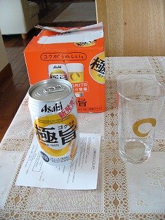 今日は買い物に行くのだーそれもやすーいものを探し回りにね最初は開店したてのユニクロかなあとは、まあ適当にね(^_^)さて、皆さんいろいろ良いニュースがあった方が多かった今週ですが、最後にわたしにも来ましたぞ、ビッグボーナス(笑) 応募してたら、試飲缶3本とコップのセットが送られてきました偉いぞアサヒビールサントリーさんが(みねさんには黙ってこっそり(^_^;))出しても出しても、なんにも当ててくれないのに (明らかに贔屓だよねー(笑))たった2回目のチャレンジで、当選だなんてたった3缶でショボイなんて言いませんコップはいらないから4缶にしとけ、なんて言いませんやっぱりこれからは、アサヒの「極旨」(ごくうま)ですよ「極旨」時代はね、「ザプレミアムモルツ」から「極旨」へあー不味かったらやだなあたった3缶のことでこれだけ宣伝してねえ(^_^;)