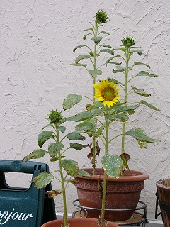 誇らしげに言ってますがそんな大層なことではないですよね1年以上前になんかしらでもらったひまわりの種7つもらって、忘れてて植えたのが、夏を超えて8月の27日の前植えてから40日ちょっとで咲きましたー ぷぅさんとこで小さいのは10センチって書きましたが、さすがにウソでした一番小さいのでも20センチくらいはありますが、それでも育ちが悪いですあと、突然に、病害(褐斑病だったかな?)に侵されたんで心配しましたが、オルトランは効果がなかったものの、モスピラントップジンスプレーをかけてなんとか食い止めて咲いたものです(葉が白っぽいのはスプレーの跡です)秋雨に煙るひまわりって・・・・素敵やんって言いたかったんですが、花は小さいし、葉はボロボロ種出来たらどうしましょ・・・・調子が悪いのは、ジューンベリーでしてなんか葉っぱが黄色くなってはらはら落ちてるんですが、もう落葉して良いんでしょうか? そのわりに先の方で花とか咲いてるんですが??心配です ((((;´・ω・`))))もっともっと大きくなるはずだったんですがねえまだ実の一つもできてません 難しいものです