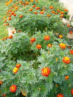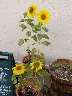 昨日は、絶対体感で30度に行ってました汗吹き出るんだもの、Tシャツ1枚なのに (;^_^A それでもね、秋モードにしなくちゃいけないんですが、庭は夏モード全盛なんですよ困ったモンですねえ、この地球温暖化(違うかな) ひまわりが満開から散り初めかなあなんか種が一杯出来そうですね来年はひまわり御殿にしちゃおうかしらん・・・・・って、「わたしはマストロヤンニで、ハニーがソフィア・ローレンかい」って、突っ込んでみても、誰も知らないよね(泣)「ひまわり」名画だと思うんだけどさあとは、真夏かよって言いたくなるコリウスの群れ 全部で6種類あるんですが、最初に買ってきた左の黄緑のがでっかくて残りの初夏に購入した、新たな5種類(わかりますか? 後列に赤、紫、前列に緑、赤、緑です)も根付いてちょっとひしめきあってます我が家の絶好調は、なんといっても昨日のマリーゴールドとコリウスなんですが、本当に寒くなるとダメになってくるんでしょうかねえなんか、コリウスの大きいやつなんて、シュートみたいなの出して花咲かせてるんですけど (^_^;)「マリーゴールド」と「コリウス」と「ひまわり」に包まれる謎の変な家って、ちょっといや(笑)