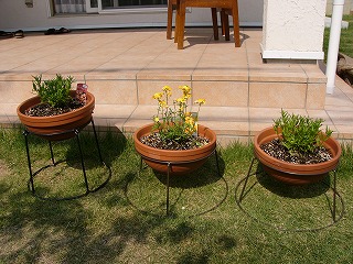 実は先週末に来てたんですがね苗来ました 樋口一葉さんが飛んでいった苗例のキリンさんの苗ですよっぽど嬉しいんだろうって(^_^)その通りです、すっごく嬉しいついに待望の第2子がという方や、デジカメ買って最高の席で野球見た方や、ナビと勝負してる方や、ドアをぶいぶい鳴らしてる方や、いちじくが美味しそうな方や、ボルネオ行く方や、家が完成した方や、おそば食べてる方や、うどん作ってる方や、挨拶された方や、個展開く方や、神戸に単身来る方や、男前に会えそうな方や、もっともっと嬉しいことがあったニュースを書かれてる人がいますが・・・・(もちろん、ここに書いてない人も忘れてるわけじゃありませんぞ(^_-)-☆)まあ、そういう方々には、全然負けてますが(負けかよって突っ込まないでね( ゚Д゚))無事来ましたから、「インプレシア」とりあえず3色×2のうちワンセットを、大きめの植木鉢さん買ってきて植えてみましたー ハニーに任せたので心配 (^_^;)あと、早くどこかに移動させないとパスが (^_^;) そして、迷いつつ、さらに残ったもう3色セットは地植にしました丁度ぎっしりになったらいいなあ その奥にはバックコーラスみたいにに例のチューリップを予定しています ネコよけの網はちょっとみっともないけどその内に外しますねなぜか黄色だけは花咲いてます残った2色オレンジとクランベリーは全然ですうまくきれいに咲いてくれるでしょうかねキャンディボックスみたいになったらいいねえ本当に楽しみですさらに右側の「五葉の松」の隣部分には「アーティチョーク」植えようかなって思ってますが、苗が見つかりません?どこかで売ってないかなあ?それで庭の空きスペースは無くなります植木鉢もラティスに引っかける分も含めてこれでもう無理ですね「マトちゃん♪のお庭」(El patio de MATO-CHAN♪)完成です (^_^)