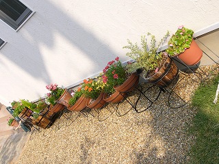 シリーズってなんなのかと言われそうですが(^_^;)まあ、良いですよねいま、日記のカテゴリー分けが足りないんで、必死になって一つ減らして、新たなカテゴリー「お庭日記」を作ったんですが、なんと旧カテゴリーに投稿した日記を登録し直すたびに、もともとのテーマの所(この場合は「家を建てたい」)に、再投稿してしまうことになることに今気づきました迷惑掛けてごめんなさい「家を建てたい」の皆様 m(__)m古い日記がばしばしと(^_^;)さて、皆さんと一緒になって、自ら建てた『家を建てちゃった人集合 (^^)v』 のテーマもぴったり11か月で何と5000件を突破ニーズはあったようで嬉しい限りですね (^^)vわたしもなんとか最多投稿タイトルホルダーの地位を奪い返すべく頑張ってこういう庭シリーズを(笑) これ買ったのはちょっと古いんですがこれはうちの奥さんがたっての願いで購入したクレストです寄せ植えに、一応パープル何とか?? パープルタイムだったかな?買いましたマリーゴールドとピンカマジョールはとりあえずの洒落です(^_^;)もうちょっと何か良いものを寄せ植えしたいんですがね 今まで、ひまわりがいた花台には、例の10円ビオラを持ってきました元気ですよー ビオラって本当にかわいいやつですねその横の焼杉の桶は以前に美しい姿を見せていた、インパチェンスのカリフォルニアローズの白とピンクです夏場に瀕死だったんで切り戻しを思いっきり行って、直射日光を避けさせてましたがようやく復活しましたね (^^)vまた楽しませてくれそうです この花なかなか可憐で美しいですね冬越し出来るかなあショックな出来事を一つあのもさもさ茂っていたレタスミックスが、2日間わたしが目を離したら腐って完全に枯れちゃいましたなぜだと思って調べると、植えていたプランタが安物?で下の方に水がたまりやすい構造で、水が腐って、コバエまでわいてましたプランターって我が家のを調べると1.底の部分が網目になって、水はけがすごく良いもの2.底の部分に幾つか穴が空いていて基本的に水はけOKなもの3.底と横面の丁度あわさった部分に穴が空いていて、何とか水ははけるが ちょっと怪しいもの4.横面の下の方には穴が空いているが、少し上なので水が内部にたまるものと4種類あるんですよワタシみたいな素人には、絶対1か2がいいような気がします今回のは4のタイプでした出来なかったんですが、いつか全てのプランターの底に穴を空けてまわろうと思ってますひどいよねー 欠陥商品だよー(○`ε´○)