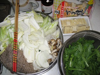こんなにダメとは思いませんでした ○| ̄|_やっぱりダメです すき焼き鍋もちろん卓上電磁調理機上でなんとか温度は上がりますが全体に沸騰するっていう感じじゃありません 一部だけ熱くなるっていうイメージですね焼くと言うより煮るのが限界ですもちろん卓上でなければ、200WIHの火力なら全然大丈夫と思います結局キッチンのガスコンロに戻して火にかけて、その後電磁調理機で暖かいうちに食べる形になりました今までのすき焼き鍋は鉄製ですが、IHはダメだったので、簡易ボンベコンロは使わなくてすむようになりましたけどね真剣に都市ガス用の卓上コンロ買おうかなあって思い始めましたただし軽いので、直火で炊いたあとで持ち運びするのは楽ちんでよいですけどねそれから今日は2回炊いて、2度目は市販割り下使いましたが、最後のうどんくらいはなんとかなりますすき焼き鍋にフタ付いてる理由がわかりました開けてるといつまでたっても全体に火が通らないんですー 今日の野菜たちですー白ネギ、玉ねぎ、白菜、シメジ、菊菜、焼き豆腐、糸コンニャク、麩、奥に割り下のビンも見えますね肉は太るから入れませ~~~ん・・・・嘘でーす 安い肉なので見せるのを拒否しましたー(^_^;)(国産、米国産半々です)