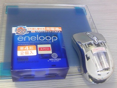 ワイヤレスマウスの話は昔しましたよね使ってみるととても便利ですが、そしてやめられなくなりますがその電池の減り方たるや、毎月交換必至というものですわたしも100均や量販店安売りなんかを使っていましたが、段々面倒になってきまして、とうとう買っちゃいました この前ジャスコに買い物に行ったときに、カード会員は少しだけ安くなる日でしたので、この会社のPC用のマウスには、サンヨーの良く宣伝してるeneloopの充電池単四4本及び充電器セットをちなみに家でもワイヤレスですが、それはけちって、プライベートブランドのイオン充電池セットにしました 2割くらい安いです違いはなんなんでしょ どう見てもデザインそっくりですが充電時間は圧倒的に三洋が短いんですが、利用回数は1000回と少なめです2本ずつ交代で使用すればいいので楽ちんでいいですねどっからでも来いですマウス(アウトレット1000円でした)より2倍くらい電池が高く付きましたが、ちょっと良い買い物だったなあと悦に入ってるマトちゃんなのでありました尚、これはわたしの会社のデスク上ですガラスのパッドがお洒落でしょ(^^)<追記>草なぎくんもお茶目ですね 酔っぱらって服脱ぐのでも、家の中なら大丈夫なのにねえ・・・風邪ひくくらいで(笑)
