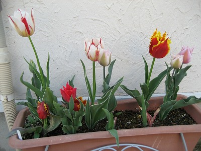 あいてててです身体が痛いです 筋肉痛です今日は芝生を一念発起あらゆる雑草を刈払機で根こそぎと思ったんですができる範囲でしかとれませんでしたそれでも一部は地面から掘り起こして、今なら芝生といっても笑われない程度にまでなりました、写真でご紹介するチャンスですまた、種まきも一部しましたよそのあたりもまたご紹介する機会があるでしょう写真用のメモリに余裕があるとこういう引っ張りも簡単ですね(^_^;)大阪はこの1週間は本当に5月の気候でした本当に土曜日には車にエアコンで冷房もかけました気温が上がり一気にいろんな花が咲き始めてます庭もいじりたくなるというものですチューリップはそろそろ最終コーナーでしょうか結局今年は「夜の女王」が咲いてないのが残念ですが購入したヨハンシュトラウスは終わり、ハウステンボスは満開終了そして この右のオレンジベースのチューリップが「ダベンポート」ですが、残念ながらできが悪いです 植えた数に対して花が少ないです今年は変な天気だったのでやむなし(途中でつぼみが落ちた)ですね ムスカリゾーンに植えっぱなしの地植えのほうもそこそこ咲きましたでもちょっと飽きましたね 3年目ともなりますとねえ来年はもっと違うことをしてみたいです わたしが今咲き始めた中でもっとも気に入ってるチューリップはこの小振りな真紅のチューリップですねきれいに咲いてます ユリ咲きと思うんですが、違うかなあユリ咲きの名花「バレリーナ」はもっと橙色でこのあとから咲いていくはずですので、これはおそらく2年前に買った名もないチューリップですが、それでも真っ赤で綺麗ですよね、この花赤いチューリップの花言葉は、愛の告白、恋の宣言、美しい瞳だそうですわが家では現在は不要(*^_^*)ですので、欲しい方はご一報(笑)