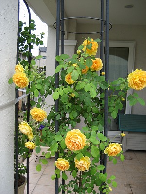 ついに出ましたね 新型インフルエンザまあ、水際阻止なんて無理だろうと思ってましたが やっぱりーただ関西で先に出たのは意外でした国際交流は東京の方がすごいですからねいわゆる外人さんの数は全然違いますから 持ってはいるとすれば成田空港かなあと思ってましたですーまあ、弱毒性ですからどたばた騒ぐのは何ですが、気にはなりますねきっと明日の出勤には、マスク人ですごいことになってるのではないかと関西人はこういうとこは反応早いですから (^^;;そして私は原因不明のめまいに悩んでますなんでしょうねえ 加齢だったらやだなあ(泣)そういう状態なので今日は満開の花画像だけ載せておさらばしまーす 最後のイングリッシュローズ「ザ・ピルグリム」が今満開になりましたこれはちょっとツルバラっぽいところがありますが、それでもご覧の通りにオベリスクの中できれいに咲いていますモリニューよりちょっと薄い色合いですが、なかなか美しい花です中ぶりのカップ咲きです 匂いはかるーいです 残念なのはこれも散るのは早いんですよねー特に今日は強風なのでバラバラと散っていきました本当にねえ、もう少し長持ちしてくれればねえ この前に倒れたのでこの鉢にはひびが入ってますまたもう一度倒れたらいやなので、テープで柱にくくってますあーかっこわるいー(^_^;)でも咲きっぷりは今年はなかなか良いですよね本当に上出来のイングリッシュローズたちでした今週はジメジメしてたので次週にでも追い肥をやろうと思いますそれでは皆さんも無理せずに明日から新しい週頑張りましょう (^_-)v