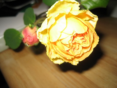 昨日までは良い天気でしたさすがにちょっと曇ってますが、今日も何とか保ちそうですねアバターはやられました右左中右中中左左左××○○××○××左3連続ですね あてになりませんねえ都市伝説さすがに明日は右でしょうさて、多忙にしてます わが家ですがバラだけは元気にしています折角ですから がばーっとまず折れちゃったモリニューですが 元気よく咲きましたねこれはきれいな花でねえ 薄い黄色からオレンジっぽく変わっていきます どうですいっぱい咲いてますでしょ嬉しくなりますねえ もう一枚サービスで(笑)あんまり変わりませんがそして、鉢が割れて危惧していたこれも きれいに咲き始めましたアブラハム・ダービーですこれはピンクからオレンジっぽく変わりますが、今年はこの花の芳香がすごいんですよ、素晴らしいバラのそして微妙にフルーツの香り こういうカップ咲きの花ですが、本当に何という良い香りでしょうもうほれぼれしてしまいますこの写真の花ともう一つ下の方に大きく咲いた花を切り取って食卓に飾っていますが、毎日食事の時にくんくんと一嗅ぎするだけでバラの花園にいるかのようです 去年はモリニューも良い匂い(ティーローズ香)だったんですが、今年はちょっとおとなしめですね その分アブちゃんがすごいですERは隣でザ・ピルグリムがいっぱいつぼみを付けてスタンバってますそして良い匂いのバラといえば忘れていませんかと地植えにしたティファニーが自己主張をし始めました 大きな花が数個付いていますが、本当に優美な花ですねそしてこれは満開になるとすごくバラらしい匂いがするんですが この第一号が虫にやられそうになって下向き加減で咲いたのが残念です開き加減はもうちょっとでしょうかただ、この香りに誘われて虫がやってきています今日慌ててあっちこっちにクスリかけしましたスミチオンといういつもの弱いクスリですが、この薬ちょっと臭いんですよねー、おそらくわざと匂い付けてるんでしょうけどバラって私は匂いを嗅ぎたくて作ってるんじゃないかって気がしてます天王寺界隈にティファニーの香りでうろちょろして飲み屋を探している男がいたら、きっとわたしです(^_^;)ちなみに今日の日記のタイトルでありますが、飲み過ぎのせいかちょっと太ったみたいで(泣)
