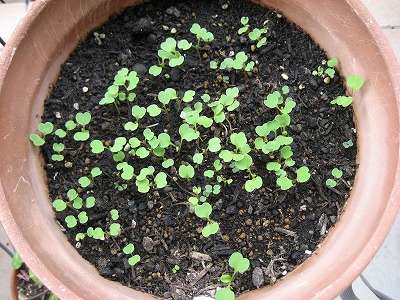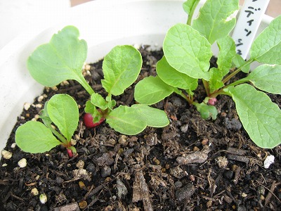 すみません アバター変です最近よく当たるんですよ 報告止めたら当たり出してバック「イエローキャンディー」シャツ「黄色のシャツ」サングラス「レンズ黄色」ネクタイ「黒でスカルマーク」全部当たったものです ついつい嬉しくて全部付けたらなんか鼠先輩みたいになってしまいました _| ̄|○<追記>それでね、あまりにも評判が悪いんで変えてしまいましたまるさんが友達になりたくないって言うから(^_^;)どうしても見たいって方は「母の日のキャンディースター」お願いしますとリクエストして下されば応じます(笑)それ以外に「カフェでデート」「渚のビーチボーイ」「獅子舞スペシャル」の3つが用意されてますのでご要望があれば(^^;)さて、それはどうでもいいんですが(いいんかいという突っ込みは無しで)そのものずばりですラディッシュが二十日大根が・・・できましたいやだからどうってことはないんですが最近重たい鉢は苦手の我が家昔は大きな焼杉桶とかを使ってましたが、今回は小さな植木鉢系に入れてます (写真はちょっと前のものです 今はもっとまるまるしてます)もっといっぱい種撒いたんですが、芽はたった5つくらいどれもまあまあ元気に育ちましたが、結果的には4つラディッシュができてますもう少したくさん作るつもりだったんですがまあ良しとしましょうハモグリばえとかが随分出るシーズンになりましたヨトウムシは今回は出ませんでしたが、これからあとは随分に惨い状態になることもあるだけに少し用心ですね置いておけばまた秋以降にこの土は使えるでしょうとりあえずほろ苦いラディッシュの風味を味わうことに致します<追記2>フェンネルとミックスレタスはどちらも全く芽が出ませんでした(種3年もの)急きょ入れ替えて、ルッコラにしていますこちらは芽が出始めました あとオクラも元気に育っています地植は全体にまあまあですが、なんと唐辛子が1本枯れましたおそらく根切り虫の仕業です(隣のものは元気なので)
