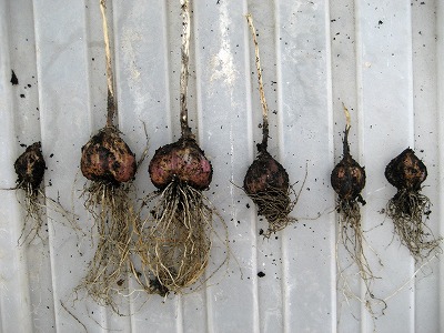 当たりましたー楽天ブログの広告非表示モニターに当たりましたー \(^_^)/ ちょっとうざいですからねえ無い方が良いですよね今なら、わたしのブログはわたし個人と同じすっきりスリムになってます (すみません つまんない嘘です(泣))毎月100円も浄財払ってますんでねえ 当然ですよねえと威張りたいんですが、当選する人はただでもします いっつも幸運な人っていますね~~~教えてもらったまるさんがはずれたみたいなのは申し訳ないですが、わたし個人としては嬉しいなあと喜んでます でも1か月だけなんですって 楽天のオケチ (^^;)さて、そういうこととは無縁の話ですが昨日書いたらこれもすぐ当てられた(つまんな~~~い)ニンニクです紫ニンニクのもう一つのプランタの方も葉の部分が枯れましたので一生懸命に掘りましたところ(全部で10かけくらい) 結構できましたー スコップと比較してますので大きさおわかりでしょうかどれもきちんと結実してます幾つかはとても大きくなってます 店売りしてるものと同等以上です ぷりぷりしてますよこれくらいなら十分に使えます国産のニンニクって結構高いですからね 有りがたい話です基本的にプランタ栽培ですので虫(主にアブラムシ)を無農薬でコントロールできたのも有りがたいですねこれで紫ニンニクの方はすべて収穫終わりましたなかなか上出来でしたねさあ、あとはホワイト六片という青森当たりの白ニンニクの方の収穫待ちですこちらはまだまだかかりそうですが、ちょっと自信がついてきましたー前回のものより今回のものが上出来な理由はプランタの深さです今回のプランタの方がより深いところに植えることができるんです前回のものは焼杉桶、今回のは深型プランタ(コンテナ)ですコツもつかんだかなあ(^_^;)