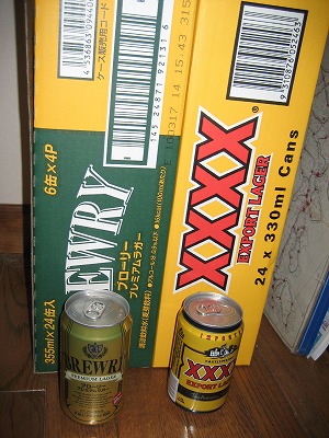 まだまだよくなりません この腰今日はこれから出張(軽いですが)に出ますので、ちょっと心配ではありますが、講演とか聞くだけなので、状況によっては、さっさと失礼して病院にトンズラさせていただきますさて、以前にコストコにいったときの買い物から忘れてたものを紹介実はこれどーんと買ってきました コストコの魅惑の輸入製品ですねオージービール オーストラリアから直輸入のXXXX(フォーエックス)とBREWRY(ブローリー)です知ってる人は知ってるっていう製品ですねフォーエックスラガーはちゃんとしたビールです 発泡酒じゃありませんこれなかなか美味しいですね 爽やかでぐびぐびと麦の香りとほんの少し甘い味わいがなかなかいいんですよつめたーいのを夏に腰に手を当てて屋外で飲んだら最高ですね120円/本くらいだったと思いますので激安ですそしてブローリープレミアムラガーは、アルコールを極端に取り除いてありますので健康に最高です0.9%のアルコールでカロリーも随分オフですこの前にキリンの全くゼロのやつを飲みましたがさすがに麦ジュース感があって、もう一声って感じでしたが、これはほんのりとアルコールが入ってるのがわかって素敵です(わたしは弱いので少しだけほおに赤み来ました)いろいろ試してきて、もう日常飲む分(基本的に二人で1~2缶/日)は「金麦」でいいかなあって思ってきましたが、値段がこれだけ接近してるんだったら本物のビールが良いですよねーちなみに、この土曜日の日経に掲載されていた専門家が選ぶバーベキューに合う(つまりちょっとだけ温度が高い状態で美味しい)ビール系飲料では1位 麦とホップ (サッポロ)2位 金麦 (サントリー)3位 MD ゴールデンドライ (サントリー)4位 豊か<生> (サントリー)5位 クリアアサヒ (アサヒ)となっていましたが、ちょっと眉唾~~~(笑)値段的に違うビール部門は別でしたが、XXXXは値段的にこちらに近いですからね、正直なところ、それなら2割高いXXXXの方がいいなあって思ってしまいましたということでこのビールは本当に良かったんですがもう無くなりかけてます・・・欠点はコストコまで行かないといけないことですね~~~(T_T)