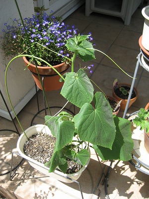 何というかすごい雨が時々降ってます今日少々遠地に出発する方がいらっしゃいますが、さすがにこれだけ一気に降雨が来るとフライト出発難しいなあと思うくらいの雨が降ってます(^_^;)(風ではないので、すぐ小やみになれば飛べますが)行ってしまえばずっと晴れのようですからうらやましいのですが、往路はちょっと揺れそうですねえ(^^;)当方の庭もすごいドロドロになるような雨でしたが、幸いに朝は何ともなかったです、その後また大雨降ってますがと言うことで(-_-)今日は、からっと野菜の関係を(笑) 例の福袋のキュウリに花が咲き出しました以前になんとか栽培したんですが、うどん粉病がひどいのと、キュウリそのものもなんかひねた感じで美味しくなかったんですよねー今回はとりあえず適当に小プランタで栽培中ですうしろの青いロベリアは早くも夏ばて気味で限界でしょうか こちらも小さめのプランタでちょっといい加減に育ててますトマトの苗二種ですね「アイコ」と「・・・(忘れた)」少し水が切れ気味に育てると美味しいトマトができるというのが例の緑健さんとかの考え方ですが、いまそうして育ててます肥料はちょっと入れちゃいましたが(^^;) 実は今年半信半疑で植えてみたいつもの地植野菜ゾーンなんですが・ししとう2本が× ・唐辛子1本× ・トウモロコシ1本 意味無かったと悲惨な状況でありまして、ナメクジ(だと思う)に無茶苦茶にされましたが、なぜかトマトだけは元気いっぱいに育っちゃいました結果として、随分なフレッシュトマトを供給してくれてまして、この写真でも見事に実を付けてくれてますでしょこれで、既に5~6個食べ終わったんですが、さすがにこの時期になって、ごらんの通り果実に割れが入り始めました梅雨時分の過湿で、水を吸い上げすぎて皮が耐えきれない状態になってるんですが、これはしょうがないですねまだまだ夏以降も元気で水分たっぷりの果実を恵んでくれそうです今年の敢闘賞ですね トウガラシは今年初めて失敗して一苗が枯れましたが、もう一つは慌てて地植から救い出して、鉢に植え換えました復活して花が咲くまでになってます 少々小さめですが、それでもニンニクと相性が良いですし、いくつあっても嬉しいモノですから、いっぱいに実ができて欲しいですね最後に珍しいモノを これ雑草みたいに見えますが、実はクレソン(ウォータークレス)ですいっぱい古い種撒きましたが、育ったのはひと株だけ大事に育てて食べようと思ってたんですが、うちの奥さんが時機を逸してしまいました、いつの間にか花が大量にさすがにトウが立って不味そうですし、珍しいので種作りに挑戦中です我が家で種までできれば品種的には我が家にあってる種の筈ですうまくいくかなあ・・・ちょこっと葉をかじりましたが、例の独特の苦くてなかなかおつな風味がいいですよね ローストビーフと食べたかったですー