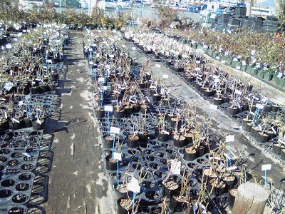昨日見ていただいたバラ園の管理を行っているのが京阪園芸という木や苗の販売や庭園管理を行っているところなんですがパークのバラ園のあとにそこも訪ねてみたんですここの会社ってあのTVチャンピオンで「バラの花通チャンピオン」に2回(2000、2003)連続で優勝したガーデナー、『小山内 健』さんがいることで有名なんだそうですねわたしさすがにその段階では毛ほどもバラに興味なかったので(^^;)今回はおられませんでしたが、チャンピオンズガーデンなる場所までありまして、なかなか楽しそうでした 案内して欲しかったなあ京阪園芸 意外に庭的な部分は小さいんですが、一生懸命みんなきびきび働いていましたね 女性も多くて楽しそうでしたバラの苗は、基本的に生産委託農家が作っていますので、そこから箱入りで送られてきたものを、小分けして出荷という感じですが、それでも段ボール箱ごと入れて保存するための冷蔵室的なところ(たぶん4度管理←自信なし)にはびっしりの苗がありましたよ・・・ちょっと欲しかったなあ(^^;) ほんの少しだけですが、こういう畑的なところもありますが、何しろ寒いシーズンですのでね ちょっとまばらでしたバラ以外にも花の苗からでっかいもみの木までなんでも売ってますが、値段はちょっと高めでしたねびっくりしたのは、こういう園芸社でも優秀性を認めてか、よそさんのバラの土や肥料を売ってますし、実際に使ってるとかもちろんオリジナルの土も売ってますいろいろうるさく聞いてたんですが、使えそうなネタを但しこれ全部庭植の場合です 鉢ですと量なんかはずっと少ないですよね・小山内さんはニーム使うけど、効果としては忌避剤なので素人さん にはかえって使いづらいですよー (基本的に人に見せる庭園では、汚いとダメなので薬剤散布は必要)・もともとの土の配合は 真砂土5 牛(馬)糞3 パーライト1.5 燻炭0.5 ・牛糞は信頼できるとこのものでないと発酵しきってないもの多し 最近は馬糞中心に使ってますが、その方ができがよいとのこと (完熟馬糞売ってましたがたか~~い(泣))・肥料は元肥で300グラム、あと時期時期に200グラム追肥で 有機肥料で与える(バイオゴールド使ってるそうです) (関西だと元肥1~2月 あと4月6月11月?) ・夏は肥料は化成肥料がいい ハイポネックスを使っている・薬剤は晴れの時は効果無いことも多い 一番ベストは雨の前で植物がわかっているとき(くもりのとき) 気孔が開いて薬剤が活着取り込まれることが必要なため・バイオゴールドは基本的には完熟鶏糞だけど、なんか良いものが はいってるんでバラの生育には良いように思うなんてところでしょうかしかし すごい量の肥料でしょ 驚かされますね明日か明後日庭植のバラに施肥しようと思ってるんですが、油かすちょこちょこで良いかなあと思ってただけにちょっとショックで(笑)