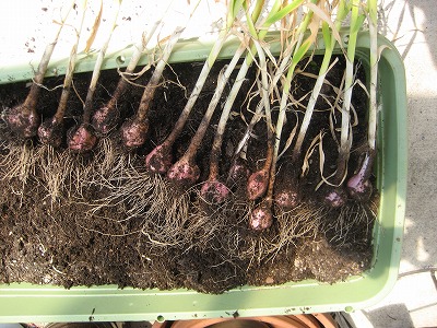ちょっと前にニンニクを掘り上げました今回のニンニクは昨年に上手に行きました紫ニンニクそのうまく保存できたもの1つをほぐして植えたものそれと島ニンニクという沖縄のニンニクの購入したものです上部の葉や茎が半分枯れればできあがりということですし、相当に枯れてきたのが5月中旬、本当はもうちょっとあとの方まで成熟進んで大きくなってくれれば良かったんですが、限界ということでしょう結果としては、この通りで こちらが島ニンニクです芽はうまく全部出てくれましたし、アブラムシ以外はあまり害虫も来なかったし、専用の肥料も追肥したりしたのですごく期待した割りには、身が小さいんですよねーもともとそういうものだって書いてますが、種ニンニクはもうちょっと大きかったような気がするんですがただし、すっごく濃厚な感じでべたべたします こっちは紫ニンニクですが似てますよねー雰囲気そっくりですし、おそらく明らかに近隣種ですね使用するときにやっぱりべたべたしますこちらもプランタで何ら問題なく栽培できました基本的にアブラムシと蛾の一種が繭的なものえを作ることさえ気をつければ、簡単にできますね ニンニクってこんなにニンニクばっかり作ってどうするんだって話でしょうけどねでも、あると何かと便利です来年用に少しだけ種ニンニクとして常温保管して、あとは料理に使いつつ冷蔵保管しようと思いますさ~~て、最初の料理は・・・・(^o^)