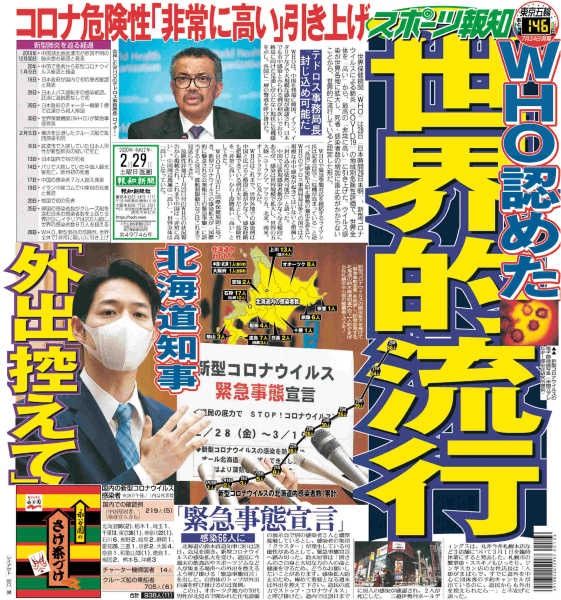 【26日のスポーツ報知から】1~3面・新型コロナ スポーツ界を直撃!巨人29、3月1日オープン戦対ヤクルト戦無観客試合に Jリーグはルヴァン杯、3月15日までのJ1~J394試合中止 世界卓球も延期4&5面・巨人春季キャンプ打ち上げ MVPはモタ!坂本は29日実戦復帰6面・西武の松坂14年ぶりに投げた!7面・一二三 左手親指脱臼 五輪最終選考会へ暗雲17面・50周年桂文珍インタビュー18面・初の新型コロナ破産 株価も下落19面・WANIMA福岡公演に感染女性20面・東京五輪開催判断デッドラインは5月 IOC委員が言及