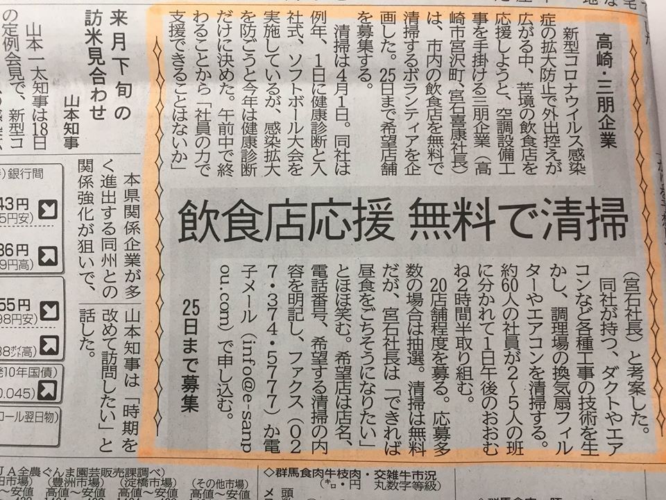 高崎市内の飲食店の皆様へ「飲食店応援活動」を4月1日に行います。当社では例年4月1日に入社式等を行っておりましたが、集団で集まることを控え取り止めとしました。そこで飲食店の皆様に対し、応援活動の一環で4月1日(水)に無料で清掃を行います。当社はダクト工事、エアコン工事を行っていますので、厨房のフードや換気扇、エアコンのフィルターや室内の壁、床、窓など、普段なかなか忙しくて手の届かない部分の清掃を行います。1店舗につき社員2~5名を派遣(20店舗程度、60名を派遣)出来れば13時から昼食をとらせていただき、14時~16時半頃まで清掃いたします。----------------------------------------------------------------------------------ご応募の方は①店 名②お名前③住所、連絡先④希望の清掃内容⑤何名で伺えばよいか?(2~5名)⑥可能であれば昼食はご提供いただけるか?を記入いただきe-mail:info@e-sanpou.comFAX027-374-5777 までお送りください。----------------------------------------------------------------------------------応募締め切り 3月25日(水)※応募多数の時は抽選を行います。 結果は3月30日(月)までにお知らせいたします。不明な点は、TEL027-374-2020までご連絡ください困難な状況だからこそ、少しでも皆様のお役に立てれば幸いです。同じ高崎市内で働く飲食店の皆様からのご連絡お待ちしております!(3/19 上毛新聞 8面にも掲載しています)