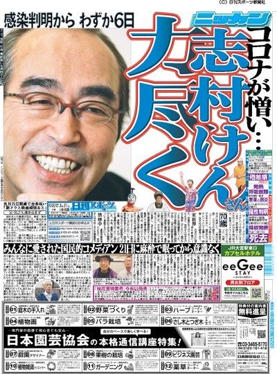 おはようございます。31日付東京本社版の1面は芸能です。ザ・ドリフターズのメンバーでタレントの志村けんさん(本名・志村康徳=しむら・やすのり)が29日午後11時10分、新型コロナウイルス肺炎のため亡くなりました。70歳。所属事務所が30日に発表しました。「東村山音頭」「カラスの勝手でしょ」「アイ~ン」など数々のギャグを生み出し、国民的な人気タレントとして活躍しました。葬儀・告別式は近親者で行う。人気ブログランキングへ