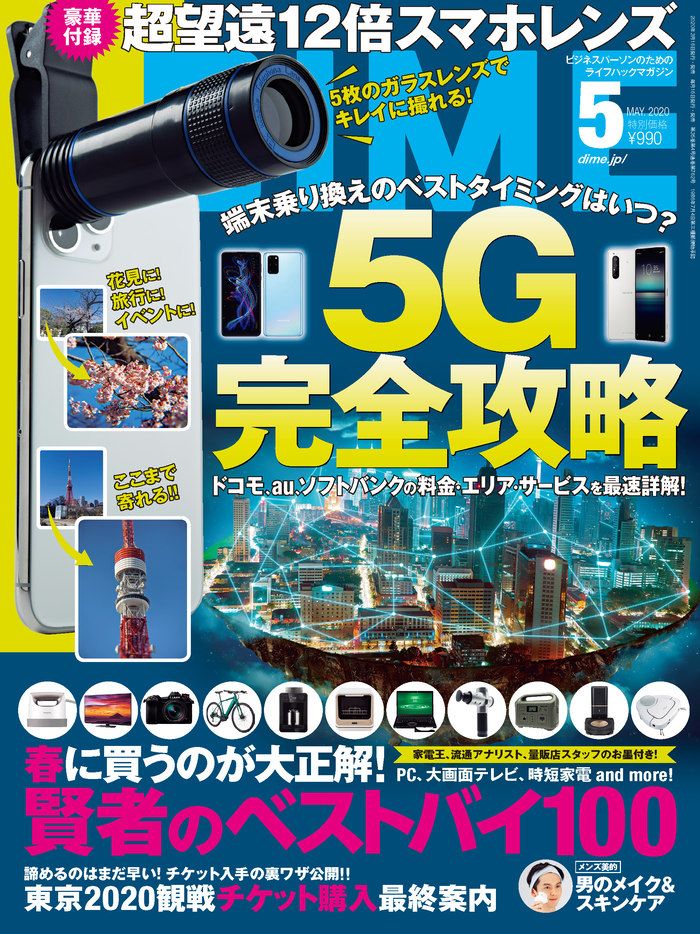 DIME (ダイム) 2020年 05月号 [雑誌]楽天で購入DIME (ダイム) 2020年 05月号 [雑誌]楽天で購入DIME (ダイム) 2020年 05月号 [雑誌]楽天で購入DIME最新号付録は、“超望遠12倍スマホレンズ”!2019年5月号で好評頂いたスマホレンズがスペックアップして登場。8倍ではできなかった花の細部や遠くの建物、動物の表情をさらにきれいに撮影ができるように。スマホのカメラを最大限に使えるスマホレンズをお見逃しなく!2019年5月号の付録として好評をいただいた望遠8倍レンズが、スペックアップして帰ってきた!昨年、作例写真を撮ったカメラマンのもりひろゆきさんに、今号の付録「超望遠12倍レンズ」も確かめてもらったところ、「8倍よりもひと回り大きく写るので、動物などの表情がよくわかる写真が撮れますね」と第一声。「花や建物の細部までバッチリ記録できますし、空港で離着陸する飛行機も迫力満点です」(もりさん)。このレンズの活用法を一足お先にお届け!<ご購入はコチラ>Amazon https://www.amazon.co.jp/dp/B085DTG67Q/※近日再入荷予定楽天ブックス https://books.rakuten.co.jp/rb/16253663/※ネット書店は売り切れの場合もありますので、是非お近くの書店、コンビニでもお買い求めください。※電子版には付録はつきません。昨年の大ヒット付録が劇的バージョンアップ!5枚のガラスレンズでクリアにバッチリ寄れる!レンズの構成が4枚(アクリル製×1、ガラス製×3)から5枚(全てガラス製)に進化。鮮明に記録できる。超望遠レンズでの撮影は手ブレしやすく、特に夜景は三脚を使うのがお勧め。[x1 レンズなし][x12 レンズあり!][x1 レンズなし][x12 レンズあり!][x1 レンズなし][x12 レンズあり!][x1 レンズなし][x12 レンズあり!]瞬時に取り付け可能。シャッターチャンスを逃さない!〈STEP 1〉スマホのカメラ部にクリップをセット〈STEP 2〉レンズをクリップにクルクルッと固定〈STEP 3〉カメラアプリを起動後フォーカスリングでピントを合わせる付属のクリップをスマホにセットし、超望遠レンズ本体を取り付ける。あとはカメラアプリを起動し、ピントを調整すればOKだ。<ご購入はコチラ>Amazon https://www.amazon.co.jp/dp/B085DTG67Q/※近日再入荷予定楽天ブックス https://books.rakuten.co.jp/rb/16253663/※ネット書店は売り切れの場合もありますので、是非お近くの書店、コンビニでもお買い求めください。※電子版には付録はつきません。文/DIME編集部 撮影/もりひろゆき(作例)、藤岡雅樹(静物)こちらの記事も読まれています旅行や出張に超便利!DIME6月号の特別付録は40kgまで量れるデジタルラゲージスケールキーホルダー、スマホスタンド、六角レンチほか便利機能が満載!DIME12月号の特別付録はカラビナ付きマルチツールプレゼン、パーティー、物撮り、議事録、DIME最新号の特別付録「スタンド一体型簡易スマホジンバル」の便利な使い方ミントのカプセルが20%増量!DIME最新号の特別付録はユニ・チャームの「超快適マスク す〜っとミント」