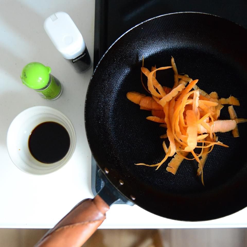 にんじんは皮ごと千切りにして、ツナと炒めてにんじんしりしり(沖縄の郷土料理)にしたり、ピーラーで剥いてペペロンチーノ風に。バジルやゴマで風味をつければ、ちょっとしたごちそうに。