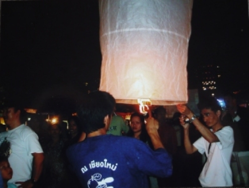 ヘロヘロになってツアーから戻った。病気かと思ったけど、ただの車酔いだった。。ゆらゆらさんに呆れられた。。。F井さんが少しラクになったというので夕涼みに3人でそぞろ歩いた。明日はロイクラトンというタイの正月らしくにぎやかでキレイだった。願い事を書いて提灯を飛ばす習慣があるらしくぼくらも飛ばす事に。3人それぞれ飛ぶ様を写真に撮ろうと、僕にもゆらゆらさんのデジカメを手渡された。(ゆらゆらさんは2台持ってた。)飛んだ瞬間・・・とてもキレイだった・・・感動した・・・。見送っていたら、ゆらゆらさんが、「ニッタンも写真撮れた?」と聞いた。「あ・・・・・・・・」「もう!何してんねんな!」ヽ(*`Д´)ノ かなり本気で怒って怖かった。