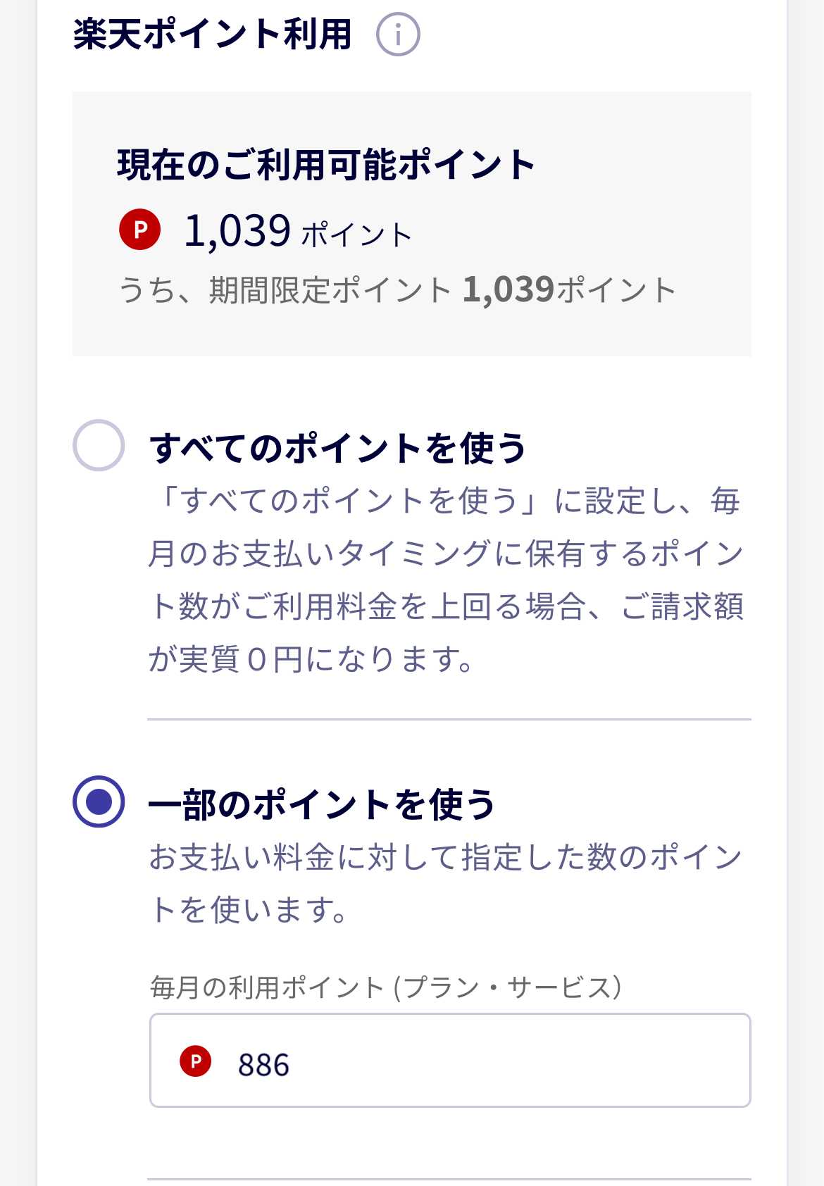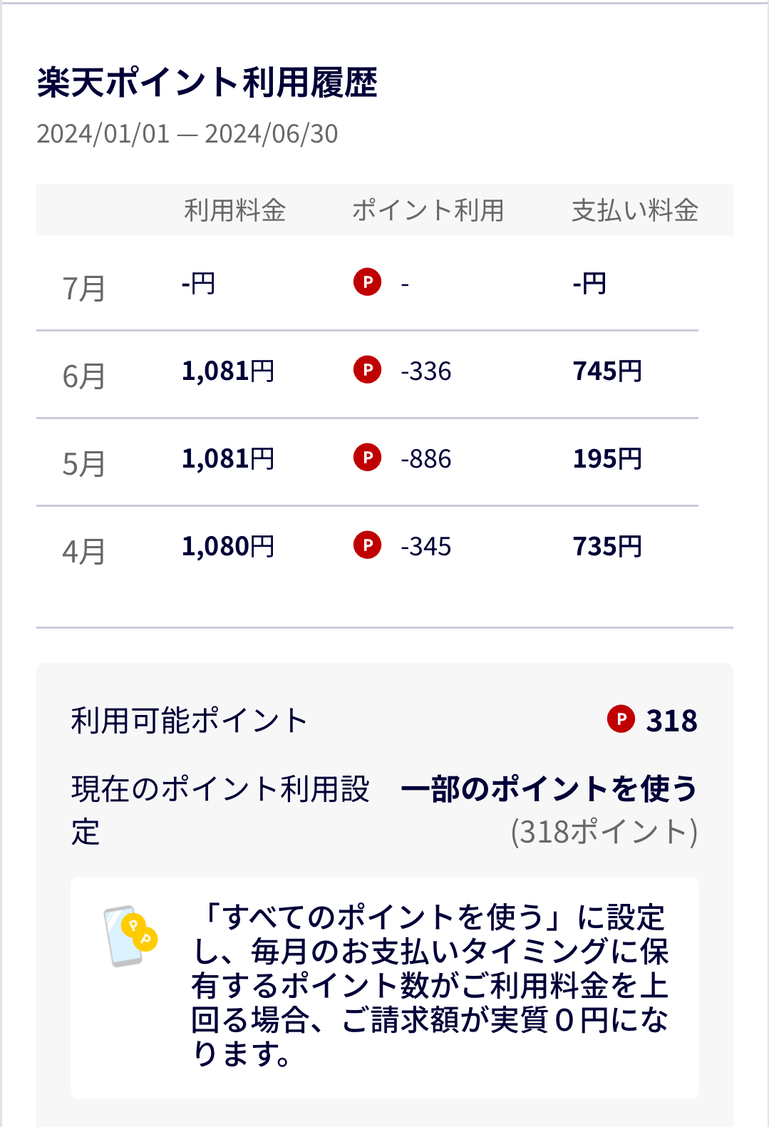 楽天モバイルを契約しています。今のところ月3GB以内で収まっており、料金は1,080円ほど。利用料金を期間限定ポイントで支払うことにしています。SPUだけでなく、その他のポイ活で貯めたポイントの活用方法ですね。チリも積もればですので、コツコツポイントを貯めていきたいです。