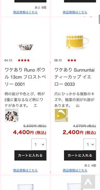 おはようございます。本日Wポイントアップ✨scopeさんのアウトレット半額、楽天でポチできなかったのですが😂(正確にはポチできたけど迷ってるうちに買えなくなった)本店さんでも楽天と同じく、アウトレット半額とのことで、、、早速会員登録して、ポチしてきました。プレート等もっとたくさんあったそうで出遅れました。本店さんでも3980円以上送料無料でした。アラビア / スンヌンタイ ティーカップ [ Arabia Sunnuntai ]アラビア / スンヌンタイ ボウル17cm [ Arabia Sunnuntai ]他店さん【今だけクーポン配布中】アラビア スンヌンタイ マグカップ 280ml ARABIA SUNNUNTAI CUP 1028186 0.28L 食器 イエロー 黄色 復刻 食器 北欧 雑貨 キッチン フィンランド 人気 ブランド 【ラッピング対象外】【今だけクーポン配布中】アラビア スンヌンタイ ディープ プレート 17cm ARABIA SUNNUNTAI 食器 イエロー 黄色 DEEP PLATE 復刻 食器 北欧 雑貨 お皿 キッチン サラダ ボウル ボール 深皿 フィンランド 人気 ブランド【ラッピング対象外】楽天scopeさんでもこの辺まだ買えます。【ワケあり ★★★】イッタラ / ティーマ ティーカップ イエロー 0006 [iittala Teema]【ワケあり ★★★】 イッタラ / ティーマ プレート15cm イエロー 0007 [iittala Teema]【ワケあり ★★★】イッタラ / ティーマ プレート15cm ホワイト 0025 [iittala Teema]【ワケあり ★★★】 東屋 / 平丸 五寸 窓に雪 03 0007【ワケあり ★★★★】イッタラ / キビ キャンドルホルダー アクア 0002 [kivi]【ワケあり ★★★】アラビア / ヴァーナ ユニバーサルグラス クリア 0008 [iittala Verna]