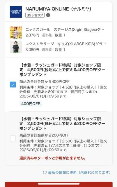 大阪はファミセですが、ファイナルもばっちりポチしてます!マラソン告知なかったからポチしたら、告知きたーー😂こちらのクーポン使用しました。400円は使用済みでわかりませんが、200円クーポンはまだ使えます。密かに?お揃い狙ってました。エックスガール ステージス(X-girl Stages)グラフィティ総柄半袖Tシャツエクストララージ キッズ(XLARGE KIDS)グラフィティ総柄半袖Tシャツラージ.ガール60%OFFエクストララージ キッズ(XLARGE KIDS)ポップアート半袖Tシャツエクストララージ キッズ(XLARGE KIDS)タイダイ半袖Tシャツエクストララージ キッズ(XLARGE KIDS)ユニフォーム風半袖セットアップエックスガール ステージス(X-girl Stages)スケボーガール転写プリント半袖Tシャツエックスガール ステージス(X-girl Stages)ラメ発泡ロゴTワンピースエックスガール ステージス(X-girl Stages)ロゴ刺しゅうメッシュキャップ黒売り切れた😂メゾピアノジュニア(mezzo piano junior)【Cuugal掲載】クリアラメポーチつきリュック140欲しかったけど、150.160在庫復活!メゾピアノジュニア(mezzo piano junior)レーストップス&タンクトップセットこれも欲しい〜メゾピアノジュニア(mezzo piano junior)ナンバリング長袖Tシャツ70%OFF♡メゾピアノジュニア(mezzo piano junior)トラックワンピースマラソンクーポン出ます!