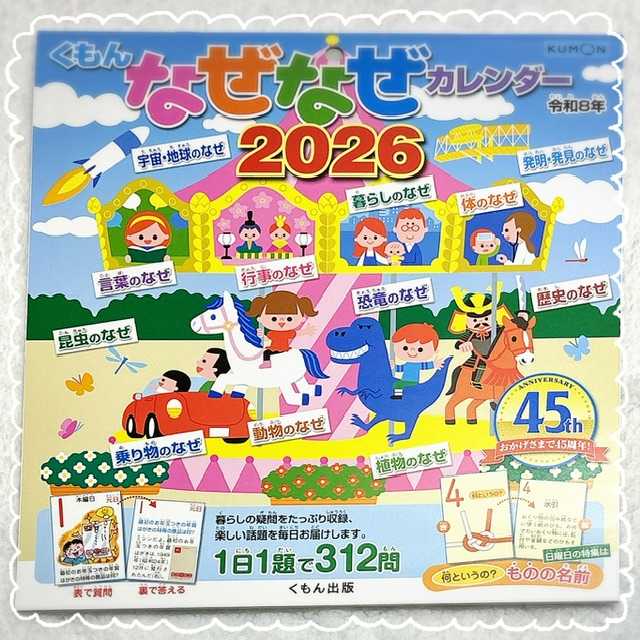 こんばんは。今年初購入のくもんなぜなぜカレンダーが届きました!楽ブでポチ予定でしたが、売り切れてたので慌ててAmazonでポチ。7日発売なので再入荷あるかもですね。1日1題問題が書いてあって、1年で312問。雑学王になりそうです(笑)裏をめくると答えが書いてあります。くもんなぜなぜカレンダー2026[本/雑誌] / くもん出版くもんなぜなぜカレンダー 大判[本/雑誌] 2026 / くもん出版楽ブでカレンダーP10倍!【H8】 頭がよくなる!日めくりカレンダー ことわざ・慣用句 2026 (永岡書店の日めくりカレンダー) [ 永岡書店編集部 ]【H7】 頭がよくなる!日めくりカレンダー 四字熟語 2026 (永岡書店の日めくりカレンダー) [ 永岡書店編集部 ]ちいかわ♡ポップアップ卓上 ちいかわ(2026年1月始まりカレンダー)ちいかわ ダイカット(2026年1月始まりカレンダー)ちいかわ コミックデザイン(2026年1月始まりカレンダー)去年買いました。【楽天ブックス限定デジタル特典】すてきな奥さん2026年新春1月号 [雑誌](稲垣吾郎さん、草ナギ 剛さん、香取慎吾さん スマホサイズオリジナル壁紙)