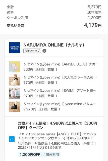 ナルミヤさんでポチしました。クーポンバグ?キャンセル来るかもですが、ポチしてみました。リセマイン(Lycee mine)【Lycee mine バレエシリーズ】フリルリブサイドゴアブーツリセマイン(Lycee mine)【SWIM】アソート総柄お着替えタオル 70cmリセマイン(Lycee mine)【ANGEL BLUE】ナカムラくんハンカチタオル(2枚セット)リセマイン(Lycee mine)【大人気カラー再入荷】リボン付きルーズソックス