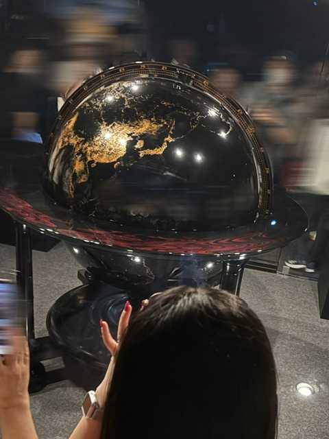 もう1つくらい海外パビリオン行きたかったけど、暑さと人の多さで断念。並ばず入れた夜の地球。能登半島地震の復興のシンボル、輪島塗りの地球儀です。